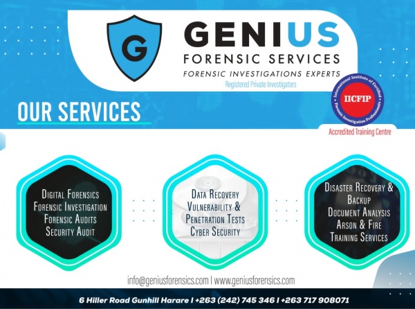 GENIUS FORENSIC SERVICES is striving to be the bestprovider of FORENSIC SERVICES (ICT SECURITY,FORENSICSCIENCE,DATA SECURITY AND DATA RECOVERY) inZimbabwe and Namibia.Providing high quality and principle, b u t i n f a c t i t t a k e s y e a r s t o m a s t e r .We should know. GENIUS FORENSIC SERVICES has spenttime perfecting the art ,skill of delivering exactly what ourclients need.By concentrating on people process andplatform GENIUS FORENSIC SERVICES has reached thepoint where we can deliver award winning industry leadingoutsourced FORENSIC SECURITY and strategic servicesconsistently to our client
