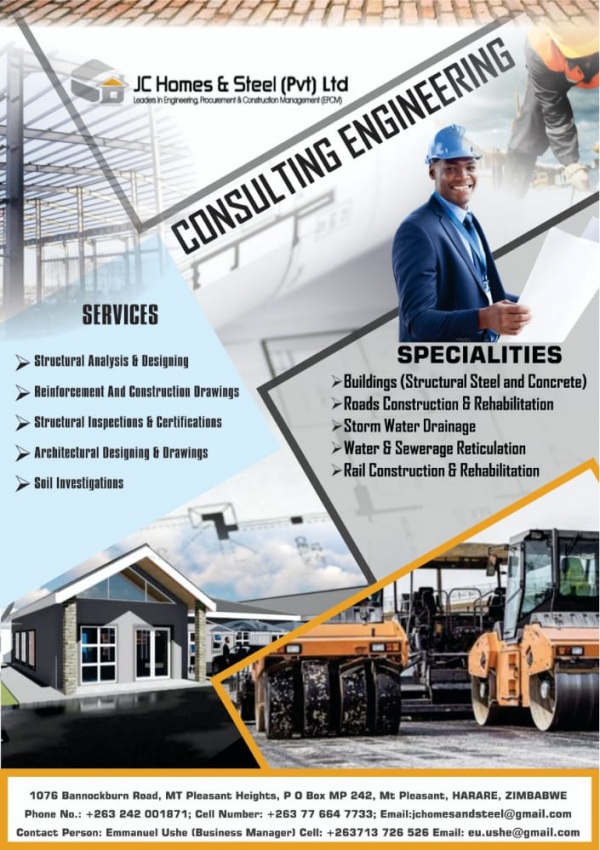 JC Homes & Steel (Pvt) Ltd is a leading Zimbabwean Consulting Engineering and Construction firm registered in 2015. We offer the following services:a) Consulting Engineering:Areas of specialty: Buildings (Structural Steel & Concrete), Roads, Storm Water Drainage, Water & Sewerage and Rail)⢠Structural Analysis & Designing and Construction Drawings.⢠Structural Inspections & Certifications.⢠Architectural Designing and Drawings.⢠Soil Investigations.b) Construction:⢠Building Construction (Residential, Offices, Service Stations, Factories, Warehouses, Churches);⢠Civil Construction (Roads, Rail, Dams, Tennis/Basketball/Netball Courts, Swimming Pools, Storm Water Drainage, Water & Sewerage Reticulation Works, etc.).c) Steel FabricationShow moreWorks:⢠Structural Steelworks (Buildings & Civil);⢠Manufacture of various types of Trailers;⢠Custom-Made, Stainless Steel Products (Computer-designed to specification).The Company has embraced the concept of Engineering,Procurement and Construction Management (EPCM)which is a prominent form of contracting agreement in theconstruction industry. The engineering and construction contractor will carry out the detailed engineering design of the project, procure all the equipment and materials necessary, and then construct to deliver a functioning facility or asset to their clients.Our core values are Innovation, Excellence and Integrity.
