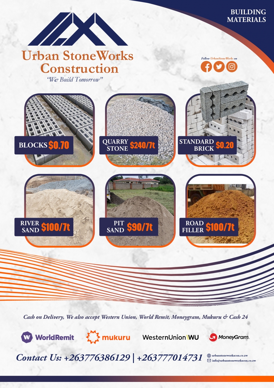 Urban Stone Works is a construction company based in Bulawayo, Zimbabwe. We offer general contracting, construction and design-build services to individuals, private and public companies for projects of all sizes. Our projects are competitively bid in a number of ways: traditional hard bids, design-build, or by negotiated turn-key process. We are committed to providing outstanding quality service on every job.We focus on high-quality, convenient and reliable projects stipulated within clientâs budget and time frame. The key services we offer include:BUILDING CONSTRUCTION AND RENOVATIONS (Commercial, industrial buildings and human settlements)⢠new builds,⢠extensions,⢠renovations⢠plastering,⢠ground work,⢠structural alteration,⢠paving and concreteShow moreworks.ROOFING (All sectors)Installation of new roofs, roof repairs, fascia's soffits & guttering, ceilings installations, refurbishments, slate & tiled roofs in public and private infrastructure, pipelinesELECTRICALS (Predominantly residential, commercialâ&âpowerâin public &âprivateâsectors)Multi-disciplinary Mechanical, HVAC and Electrical services covering, house wiring, emergency repairs & fault finding, indoor & outdoor lighting, services upgrades, troubleshooting & maintenance services.PAVING (All sectors)Paving installation including patios, driveways and paths, floor screeding (concrete floor repairs, waterproofing walls), tiling (installations and placement)BUILDING MATERIALS SUPPLIERBlock bricks (400mm x 200mm)Standard concrete bricksQuarry stonesQuarry dustQuarry fillerRoad FillerRiversandPitsand